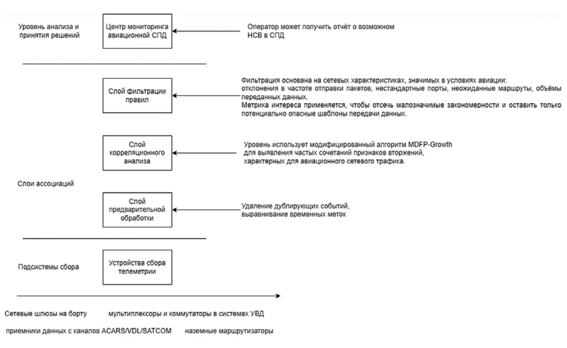 Предлагаемый метод многомерного анализа частых наборов признаков лег в основу общей многоуровневой модели ассоциации событий информационной безопасности в авиационной СПД. На рис. 2 представлена схема этой модели, состоящей из нескольких уровней обработки событий безопасности. Уровень сбора телеметрии агрегирует сырые события из различных подсистем: бортовых шлюзов, приемников протоколов (ACARS, VDL, SATCOM и др.), коммутаторов сетей управления воздушным движением, наземных маршрутизаторов и т. д. На выходе этого уровня формируется поток событий в виде векторов атрибутов, который соответствует множеству