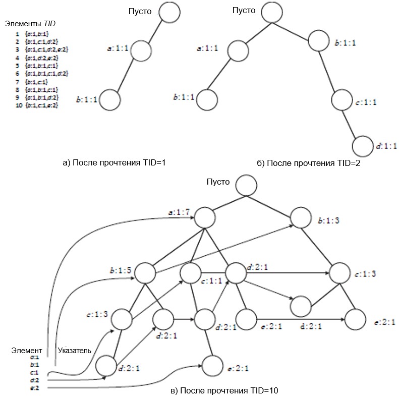, после чего этот список добавляется в дерево как путь от корня. Если на данном пути некоторые узлы (префикс последовательности) уже существуют в дереве, их счетчики увеличиваются; новые узлы создаются для тех элементов, которые встречаются впервые на данном ветвлении. В результате получается компактная древовидная структура, в которой общие префиксы событий хранятся единым участком. Это экономит память и позволяет затем эффективно извлекать частые комбинации.