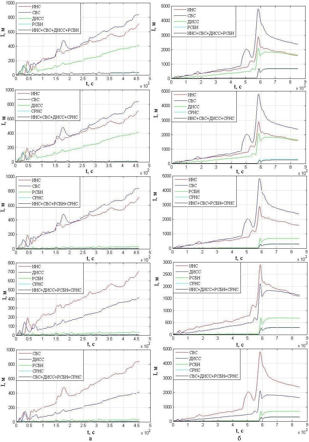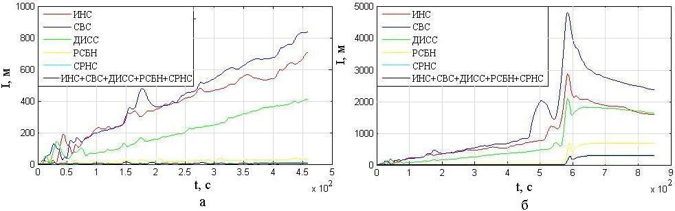 Fig. 5. The dependence of the accumulated deviation I on the results of the integration of navigation systems during flight: a – in a straight line, б – along the route