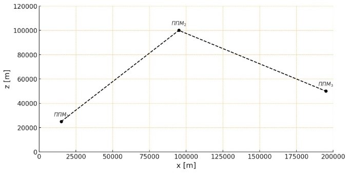The study used a mathematical model of aircraft motion as a rigid body with six degrees of freedom. When modeling a flight along a route (fig. 1), a control method using a running point was used [2][9].