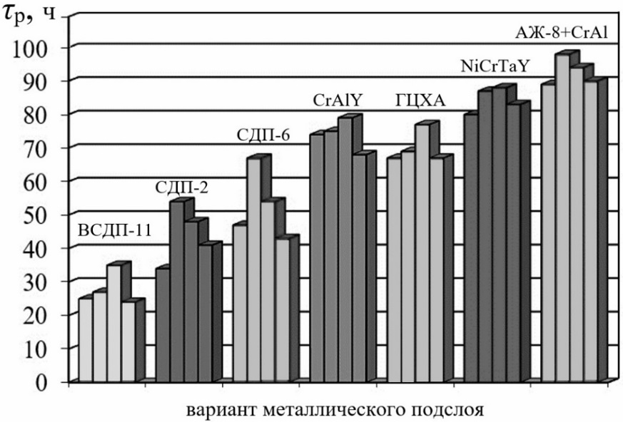 В процессе экспериментальных исследований установлено, что состав металлического подслоя в конструкции ТЗП существенно влияет на его долговечность . Так, абсолютные значения  могут отличаться в несколько раз. С увеличением температуры изотермических испытаний наблюдается значительное (в 2–3 раза) уменьшение долговечности покрытия. Поэтому правильный выбор состава МП позволяет снизить уровень напряженно-деформированного состояния на границе слоев, увеличить прочность сцепления и тем самым увеличить долговечность ТЗП. На основании проведенного исследования для увеличения долговечности всей конструкции ТЗП целесообразно использовать металлический подслой АЖ-8 + CrAl, который имеет химический состав, близкий к химическому составу применяемых никелевых сплавов для изготовления лопаток современных ГТД. Это позволяет уменьшить диффузионные процессы между подслоем и сплавом, а наличие в металлическом подслое тугоплавких элементов (тантала и иттрия) позволяет несколько замедлить рост оксидной пленки, что также положительно влияет на долговечность всего ТЗП.