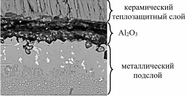 Известно [10–14], что одним из чувствительных мест ТЗП, непосредственно влияющих на его долговечность, является граница между керамическим слоем и жаростойким подслоем. В процессе эксплуатации лопаток с ТЗП кислород через керамический слой проникает к МП, что приводит к его окислению и увеличению слоя оксида алюминия Al2O3 (рис. 3).